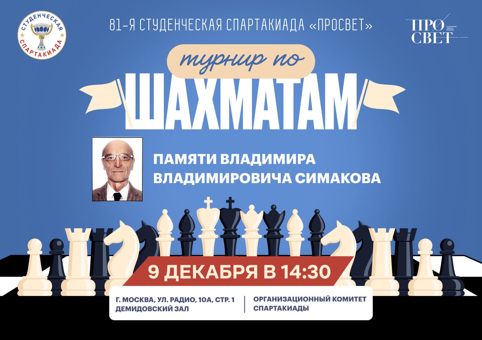 Приглашаем студентов, преподавателей и сотрудников принять участие в турнире по шахматам, посвящённом памяти выдающегося педагога Владимира Владимировича Симакова.