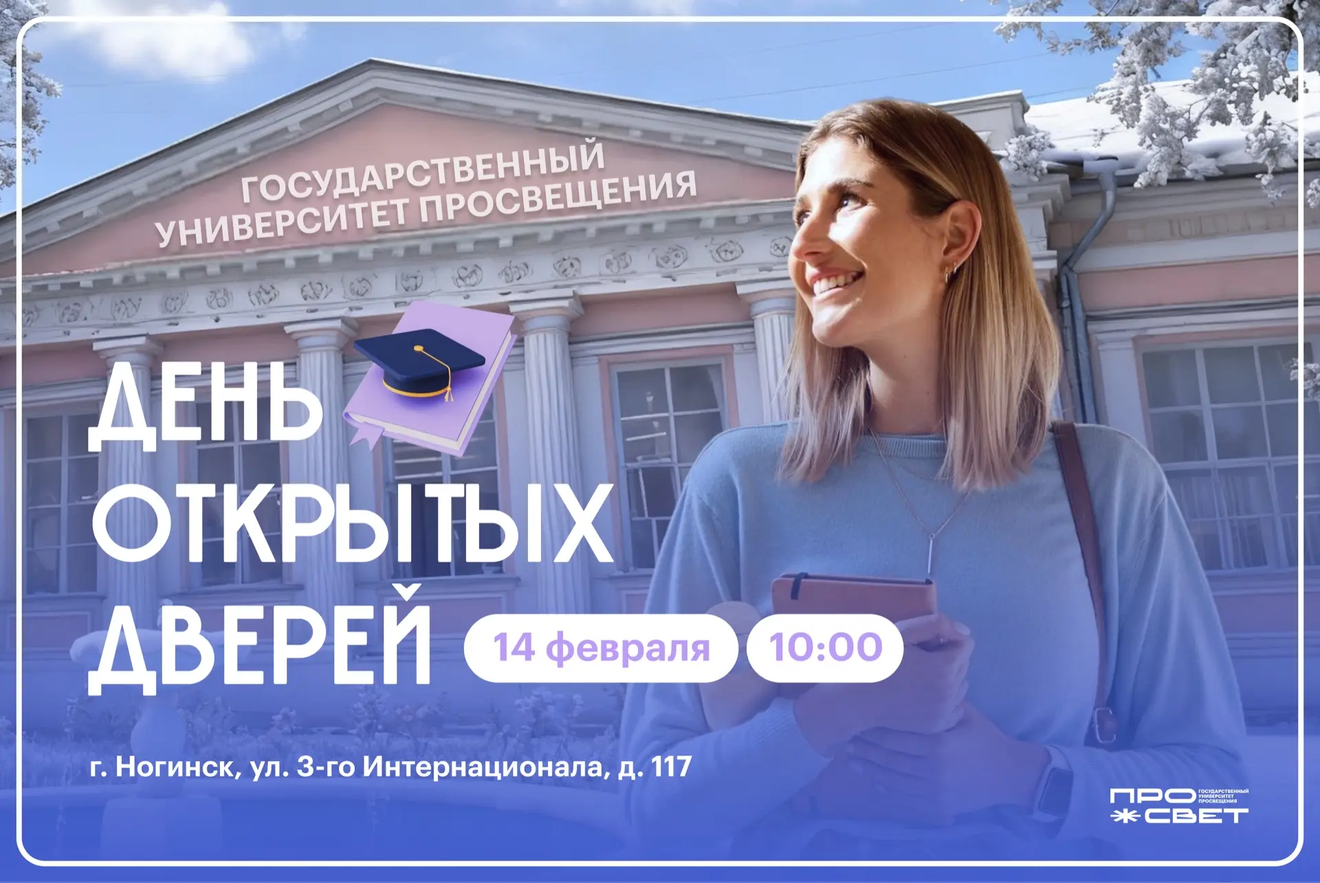 У Государственного университета просвещения есть отличная новость для будущих абитуриентов! Приглашаем школьников и их родителей на День открытых дверей в Ногинский филиал Просвета!