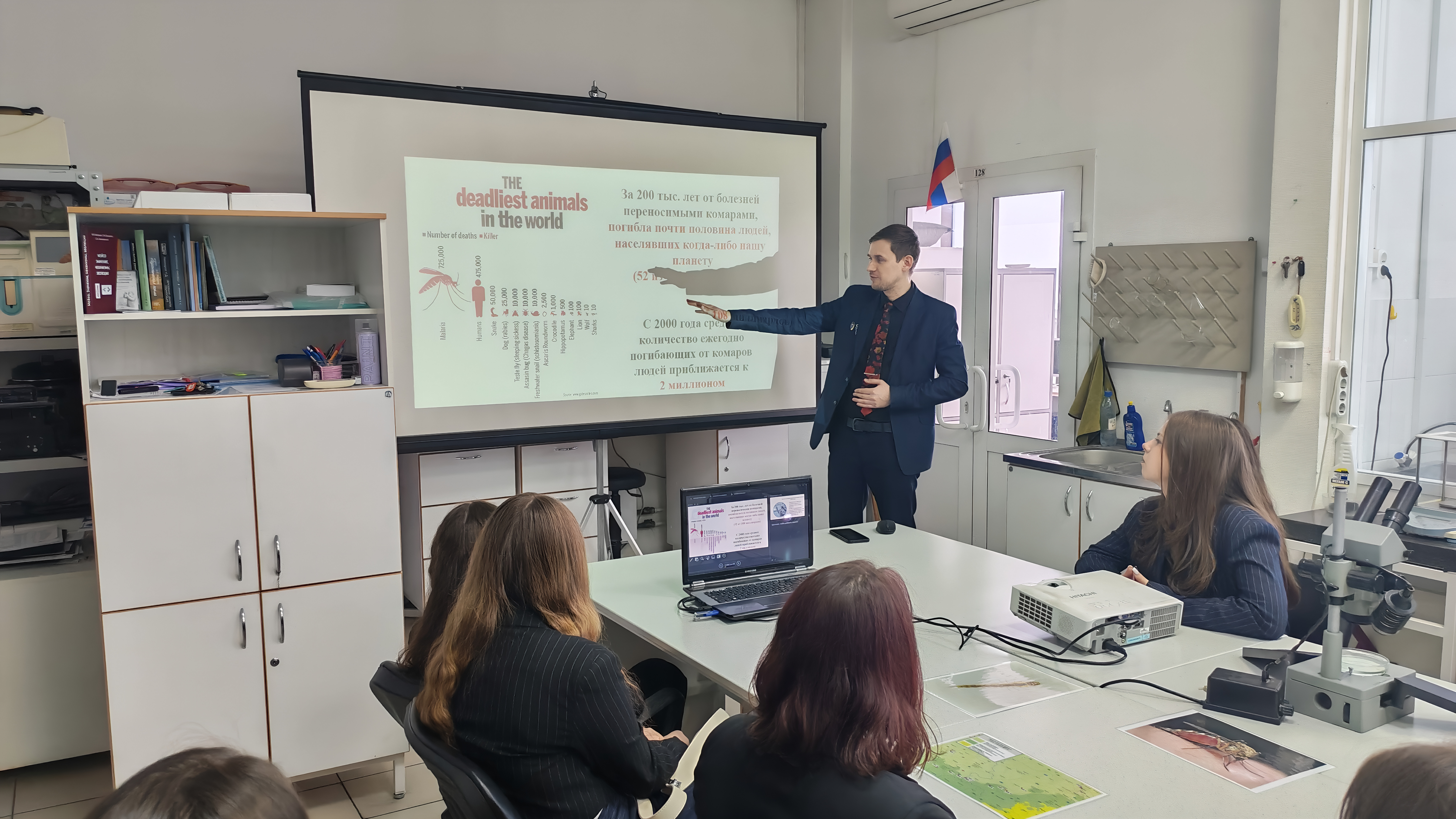- Антон Вячеславович Москаев, кандидат биологических наук, завлабораторией, доцент кафедры общей биологии и биоэкологии, выступил с лекцией «Распространение в России и расширение экологической ниши Anopheles plumbeus — единственного в Европе вида комара, способного передавать тропическую малярию» и провёл экскурсию по лаборатории для школьников;