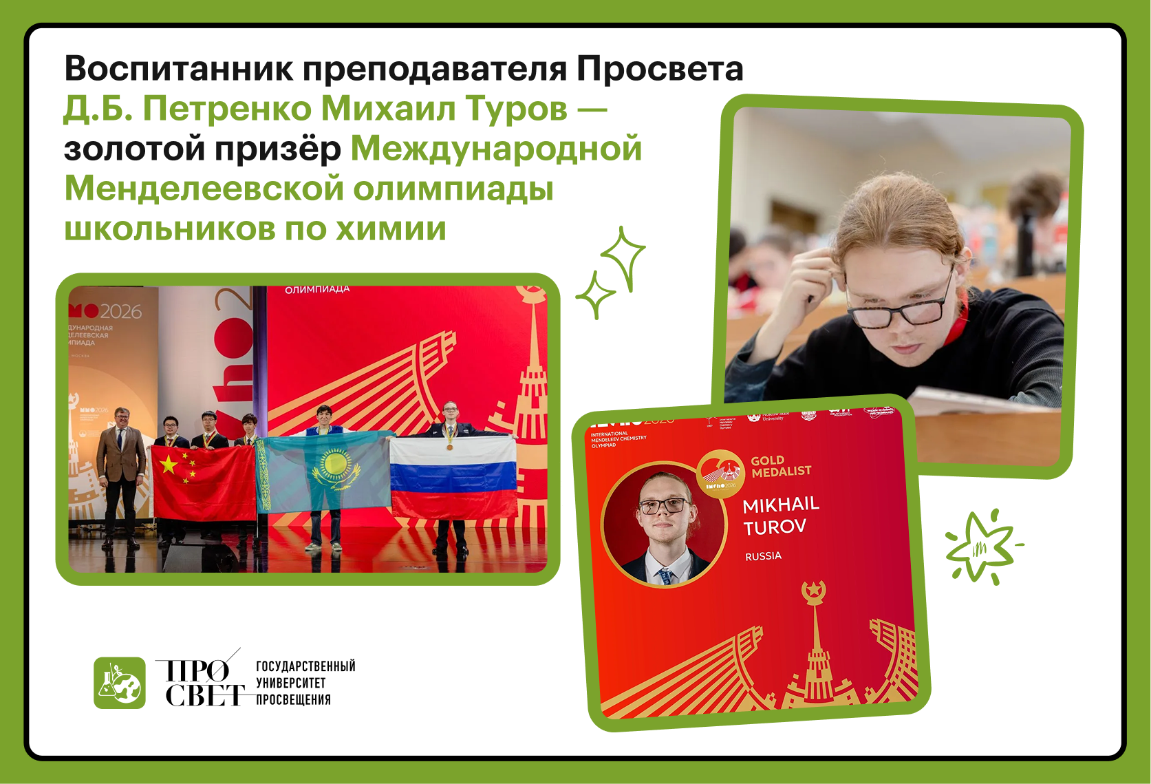 Ученик 11 класса Сергиево-Посадской гимназии имени И. Б. Ольбинского Михаил Туров стал золотым призёром Международной Менделеевской олимпиады школьников по химии.